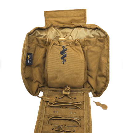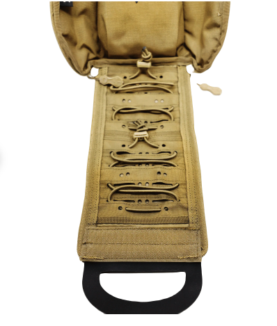 Inside, a laser-cut inner panel provides structured organization while maintaining a slim profile. Dual elastic tourniquet retainers on the sides allow fast, one-handed access to life-saving hemorrhage control tools. Two internal pockets positioned beneath the laser-cut panel offer additional storage for trauma supplies, while a diagonal outer pocket supports quick access to frequently used items.